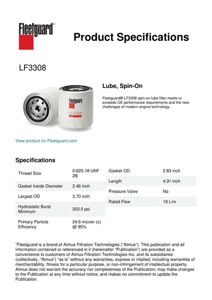 Fleetguard® LF3308 spin-on lube filter meets or exceeds OE performance requirements and the new challenges of modern engine technology.Specification