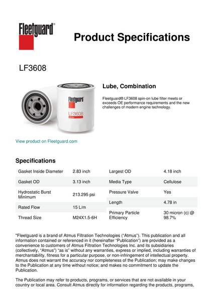 Fleetguard® LF3608 spin-on lube filter meets or exceeds OE performance requirements and the new challenges of modern engine technology.Specification
