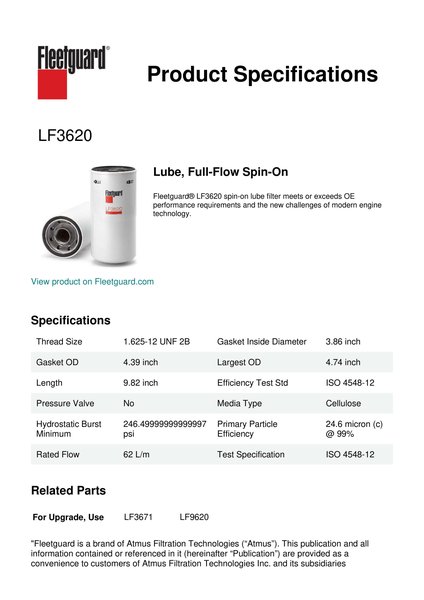 Fleetguard® LF3620 spin-on lube filter meets or exceeds OE performance requirements and the new challenges of modern engine technology.Specification