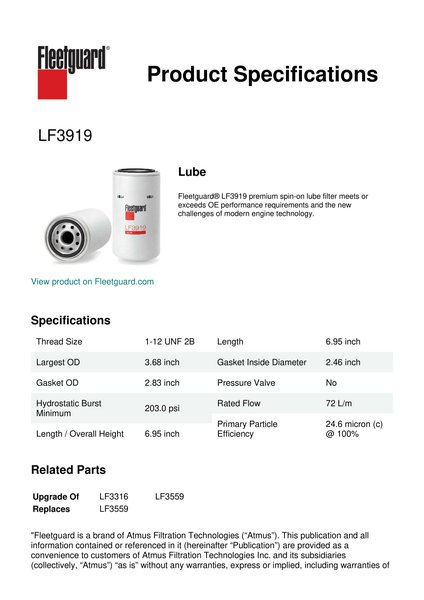 Fleetguard® LF3919 premium spin-on lube filter meets or exceeds OE performance requirements and the new challenges of modern engine technology.Specification