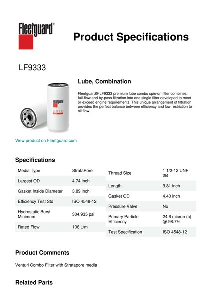 Fleetguard® LF9333 premium lube combo spin-on filter combines full-flow and by-pass filtration into one single filter developed to meet or exceed engine requirements. This unique arrangement of filtration provides the perfect balance between efficiency and low restriction to oil flow.Specification