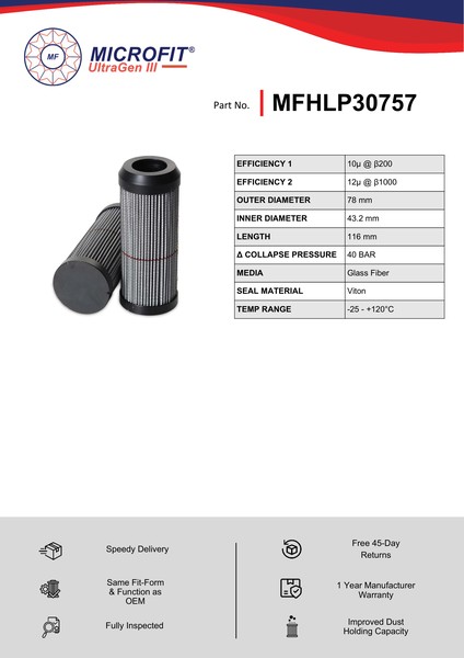 Genuine MICROFIT® UltraGen III MFHLP30757 Pressure Filter. Engineered and manufactured in Great Britain the MFHLP30757 is designed to meet or exceed the quality and performance of OEM quality standards, ensuring superior filtration performance and the longest possible filter life.Building on over 50 years of filtration expertise, the UltraGen III series is the third generation of MICROFIT® filter media, delivering exceptional efficiency and reliability.
