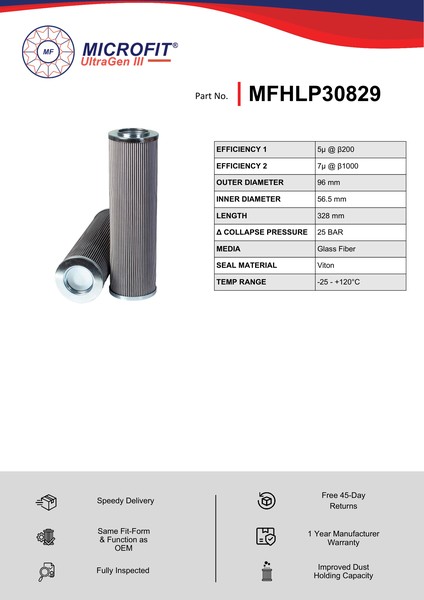 Genuine MICROFIT® UltraGen III MFHLP30829 Pressure Filter. Engineered and manufactured in Great Britain the MFHLP30829 is designed to meet or exceed the quality and performance of OEM quality standards, ensuring superior filtration performance and the longest possible filter life.Building on over 50 years of filtration expertise, the UltraGen III series is the third generation of MICROFIT® filter media, delivering exceptional efficiency and reliability.