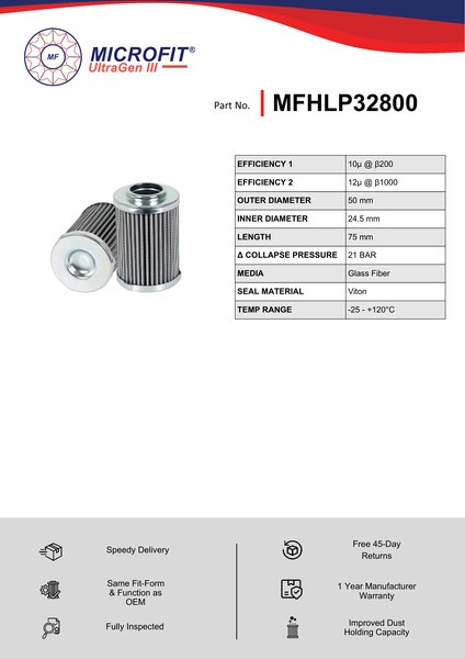 The efficiency of the element is shown using the Micron (µ) and Beta (β) ratings. The micron rating indicates the size of the particle being filtered and the beta rating the efficiency, calculated as 1/β.