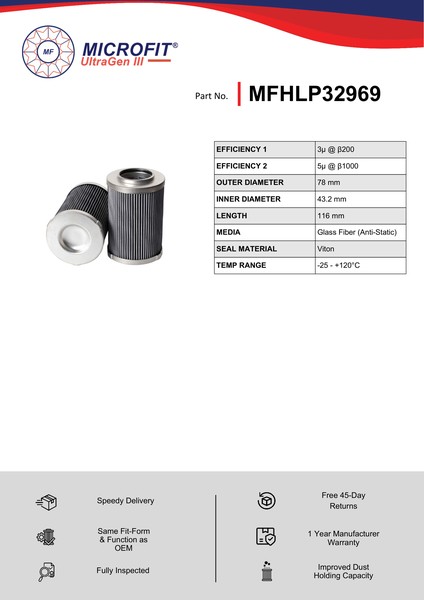 The efficiency of the element is shown using the Micron (µ) and Beta (β) ratings. The micron rating indicates the size of the particle being filtered and the beta rating the efficiency, calculated as 1/β.