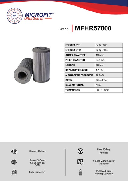 Genuine MICROFIT® UltraGen III MFHR57000 Return Filter. Engineered and manufactured in Great Britain the MFHR57000 is designed to meet or exceed the quality and performance of OEM quality standards, ensuring superior filtration performance and the longest possible filter life.Building on over 50 years of filtration expertise, the UltraGen III series is the third generation of MICROFIT® filter media, delivering exceptional efficiency and reliability.