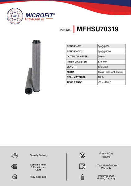 The efficiency of the element is shown using the Micron (µ) and Beta (β) ratings. The micron rating indicates the size of the particle being filtered and the beta rating the efficiency, calculated as 1/β.