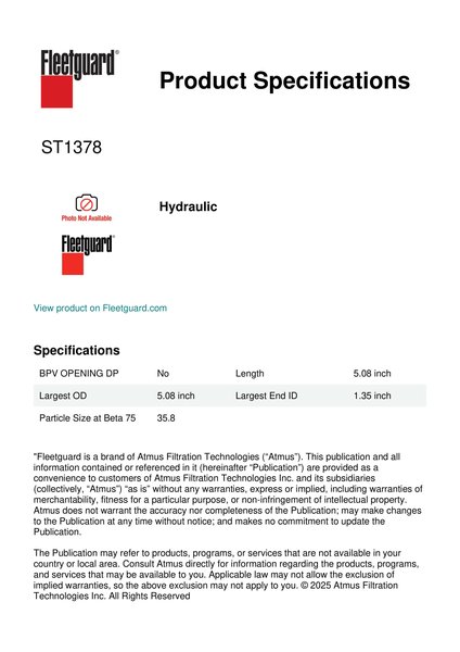 Fleetguard® ST1378 spin-on lube filter meets or exceeds OE performance requirements and the new challenges of modern engine technology.Specification