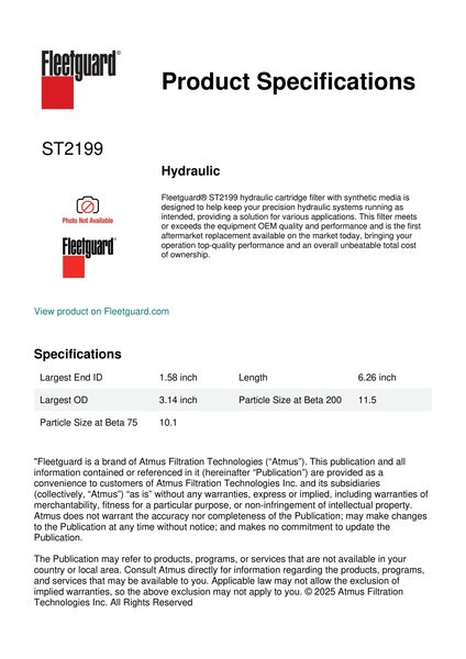 Fleetguard® ST2199 hydraulic cartridge filter with synthetic media is designed to help keep your precision hydraulic systems running as intended, providing a solution for various applications. This filter meets or exceeds the equipment OEM quality and performance and is the first aftermarket replacement available on the market today, bringing your operation top-quality performance and an overall unbeatable total cost of ownership.Specification