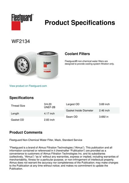 Choose Fleetguard® WF2134 non-chemical water filter for coolant system protection that provides filtration only. Non-chemical water filters are designed for use with OAT technology (which doesn't require DCA's for maintenance) or Hybrid and Conventional systems using liquid DCA's for reinhibition.Specification